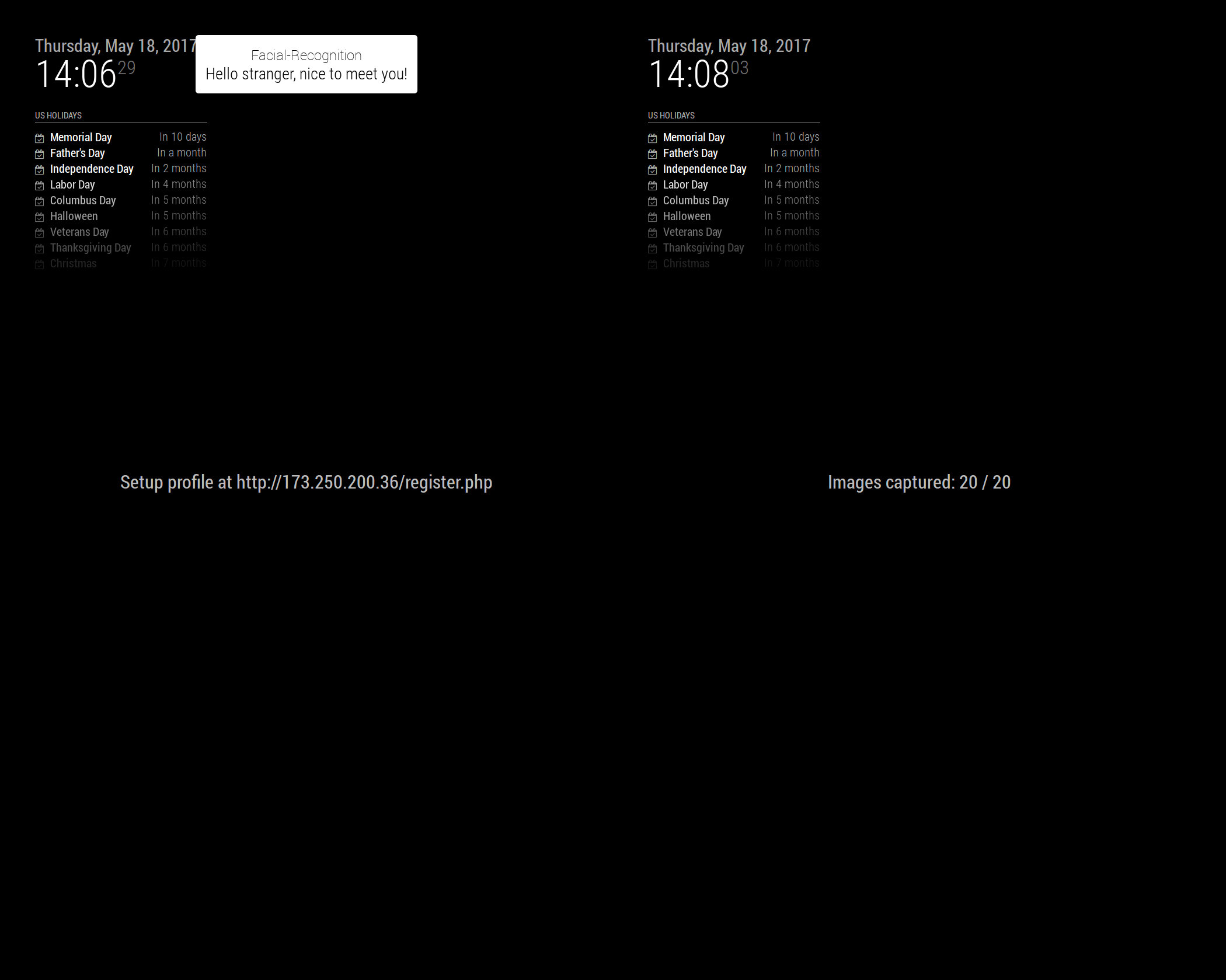 Previously, setting up the training file required using the command line to run Python scripts that called OpenCV functions. To make the training process more user friendly, we set up an automated process. Now to train a new user, the person simply stands in front of the mirror and a web address is displayed. The new user goes to the webpage and registers their account. Once registered, the training process begins and starts capturing images. Once enough images are captured, the training finished up and restarts the mirror. Now when that user stands in front of the mirror they will be recognized and greeted with a welcome message!